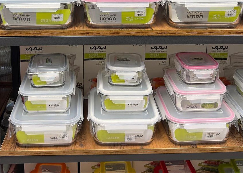 High-quality original Limon Square Glass Container Set with airtight four-lock lid available in six pieces and four colors (Pink, Grey & White). Made for long-lasting use and is very easy to clean. Made in Iran.