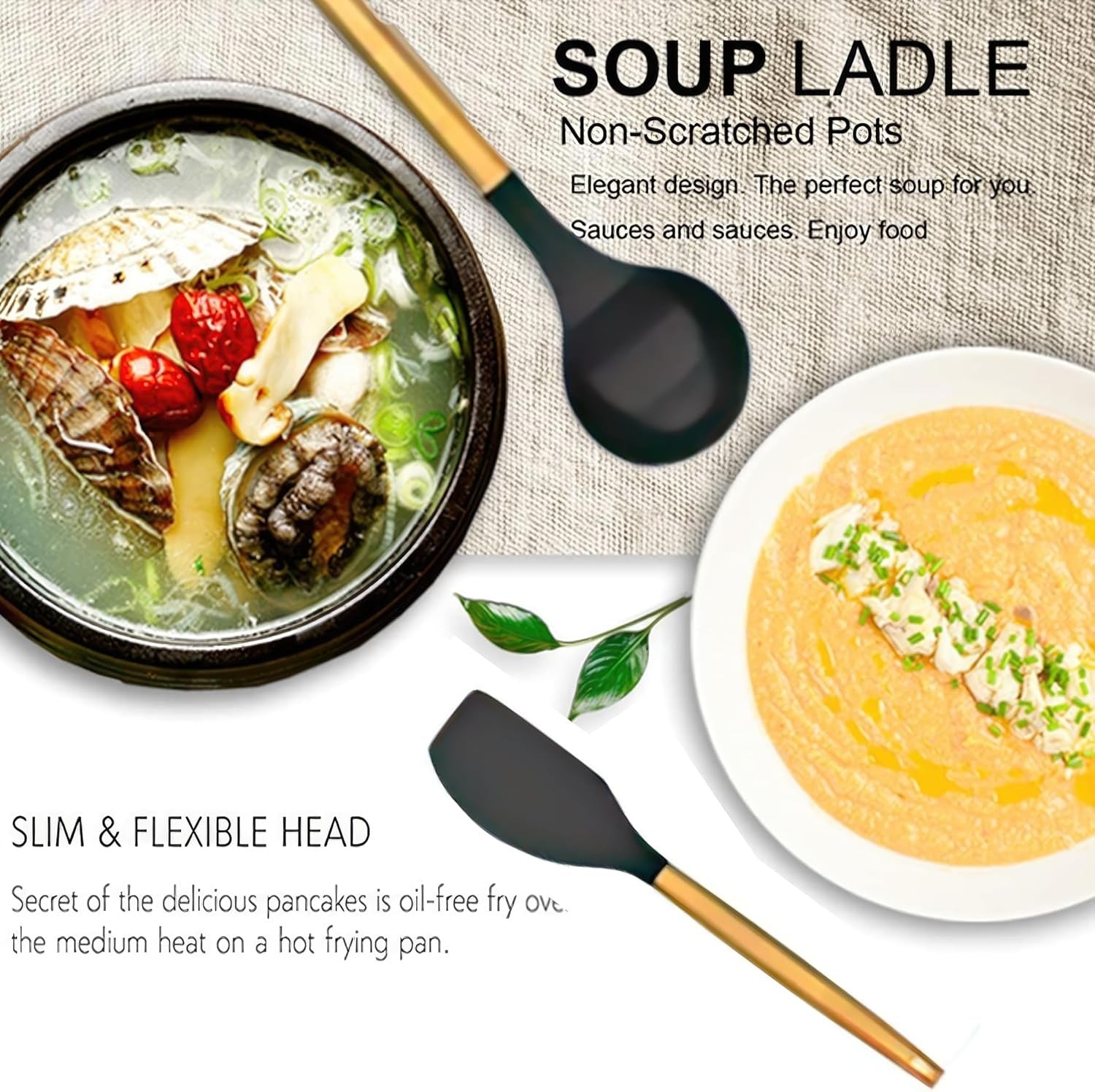 Non-Stick Silicon Kitchen Tool Set 12-Pcs (Utensils), This Utensil Set includes a Spoon, Slotted Spoon, Solid Turner, Slotted Turner, Soup Ladle, Tong, Spaghetti Server, Round Spatula, Spatula, Oil Brush, Whisk, and utensil holder.