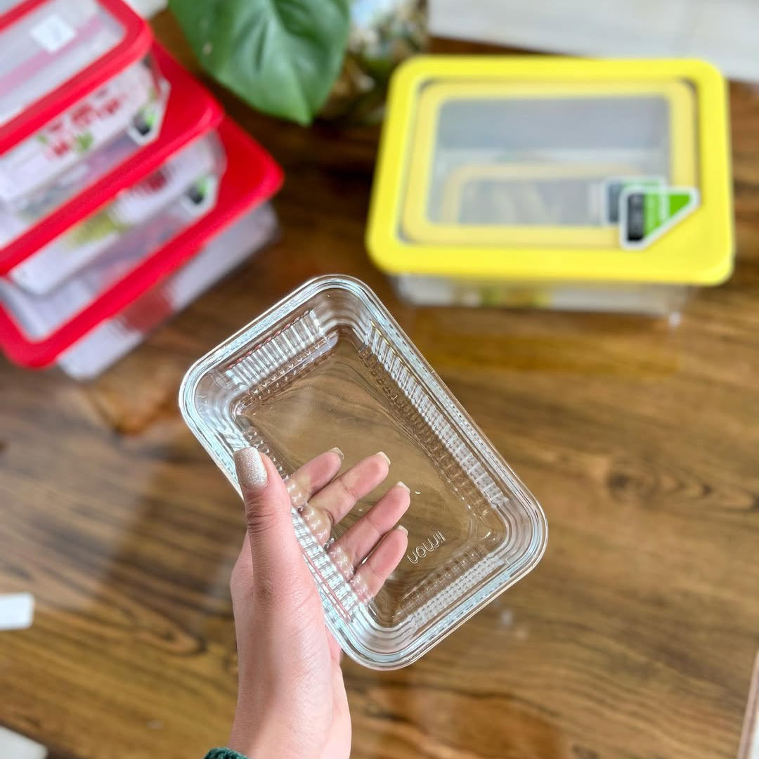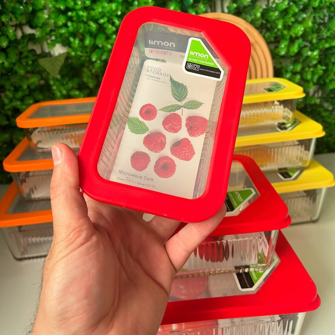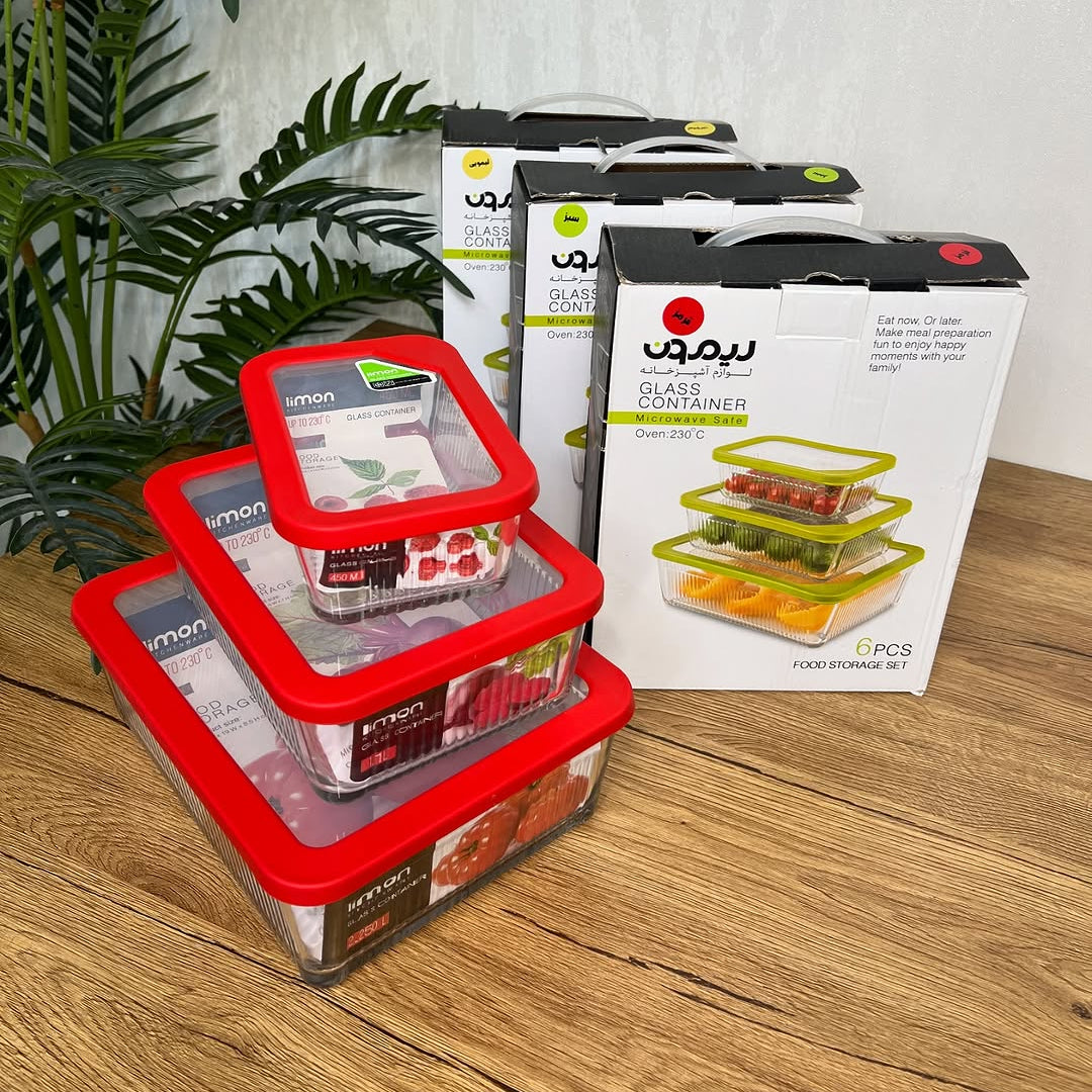 High-quality original Limon square glass container with airtight lid available in 4 colors (Red, Green, Yellow & Orange). Made for long-lasting use and very easy to clean. Made in Iran.
